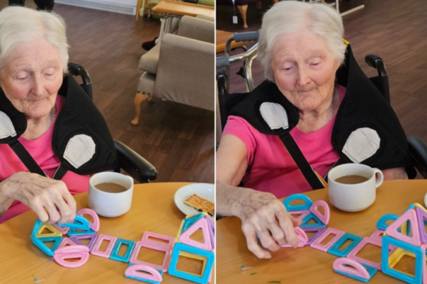 From making Cuthbert the scarecrow to 1-1 games; such as light chasing, grab catch and word soup. Elizabeth enjoyed the magnetic shapes this morning she loved the colours and she could feel the pull. She also enjoyed a cup of tea whilst creating her masterpiece.