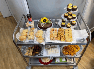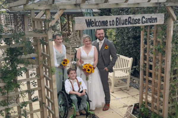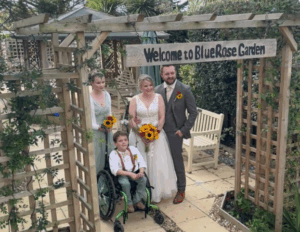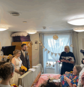 On Saturday we had a special blessing for Linda’s daughter Louise, and son in law Billy, who got married in the summer. As Linda was unable to attend, we recreated the day in her room with Rev Jules conducting the service, and all the family all dressed up! Linda’s partner Alan also sang a song he’d written for the couple. Louise and Billy made the most of our lovely garden, having photos taken by their photographer! They also enjoyed a wedding feast!